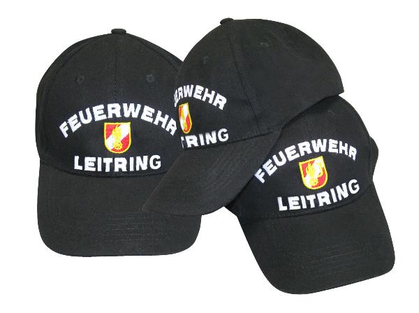 Baumwollkappe mit 6 Segmenten, individuelle Größenanpassung mittels Lasche und Metallverschluß Farbe schwarz.Schirmmütze 6-teilig mit Korpsabz. Feuerwehr und Ortsname