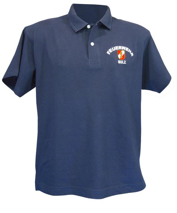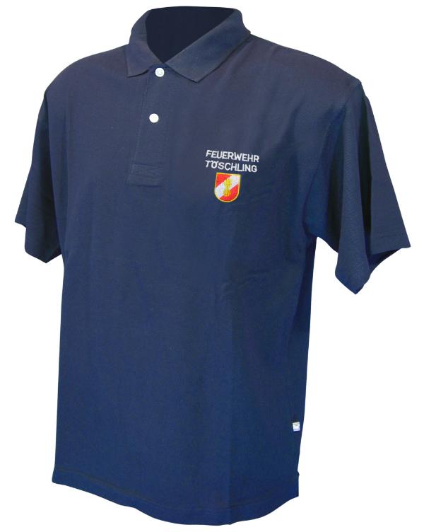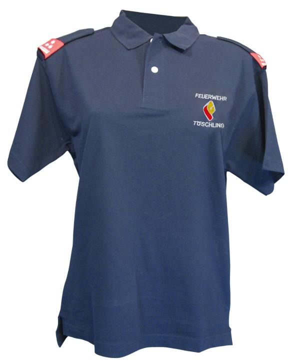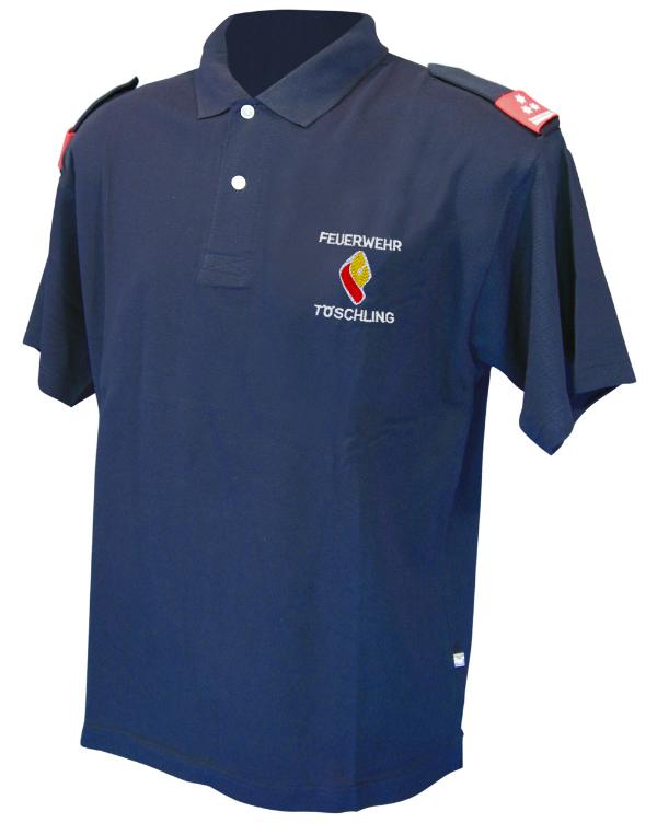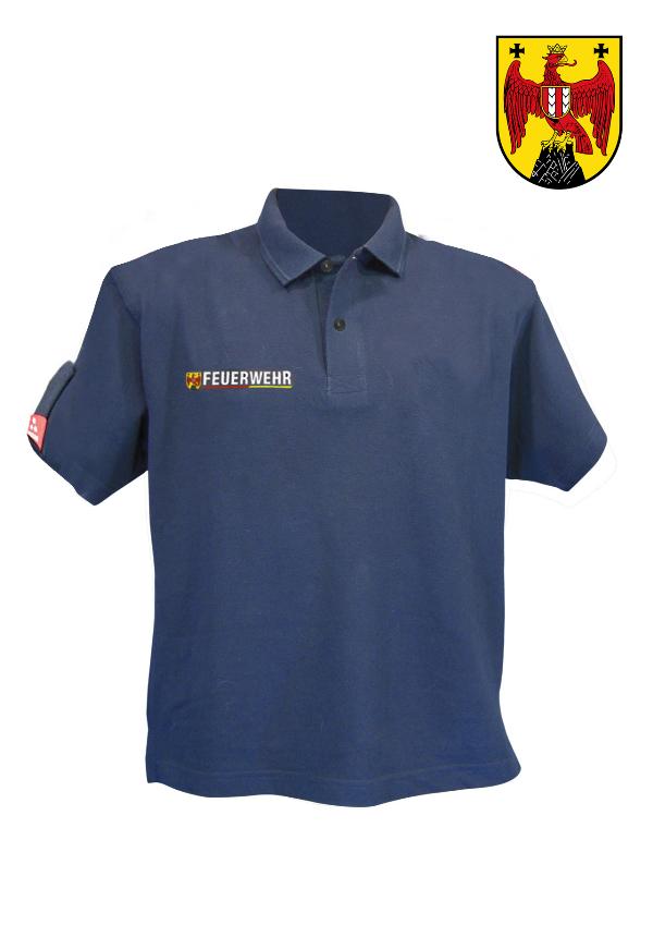 POLO STMK blau mit Achselspangen FEUERW. (rund) Korpsabz. darunter ORTSN. gerade