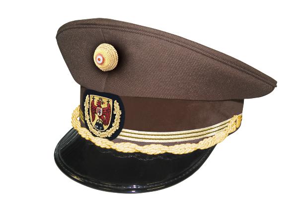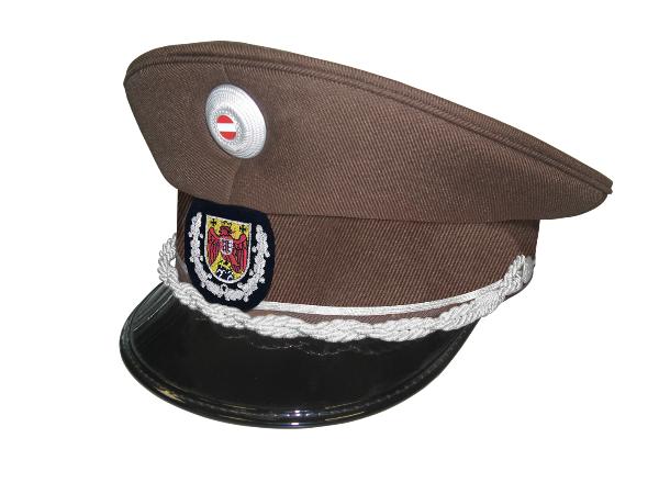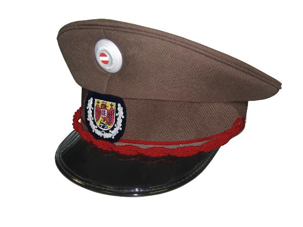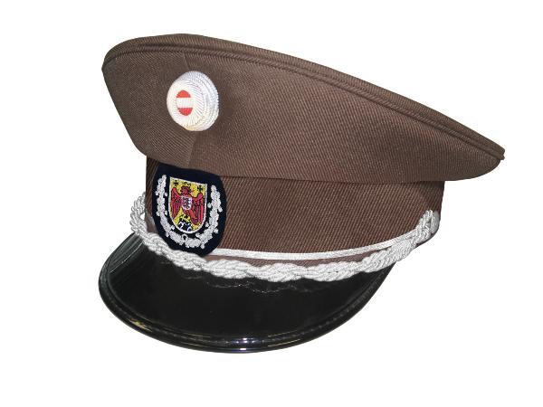 Tellerkappe braun mit Wappen Bgld. SBI, ABI, BFA, BFKRTellerkappe Farbe braun, aus Kammgarn-Serge, gefüttert mit herausnehmbaren waschbaren Schweißleder, mit rotem Samtumlaufstreifen und jeweiligen Dienstgradabzeichen und schwarzem Schirm aus wasserfestem Material, Kappenschnur je nach Dienstgrad , Landeswappen auf Samt gestickt mit Eichenlaubkranz und dazugehöriger Kokarde.Tellerkappe braun mit Wappen Bgld. SBI, ABI, BFA, BFKR |