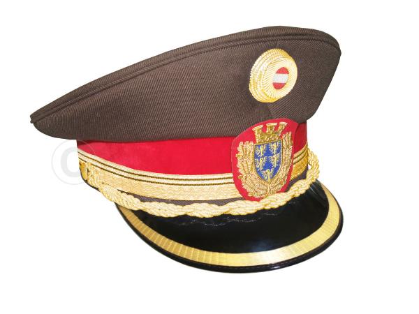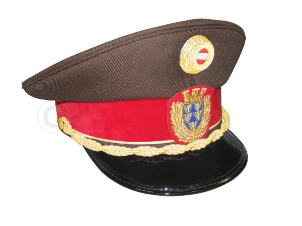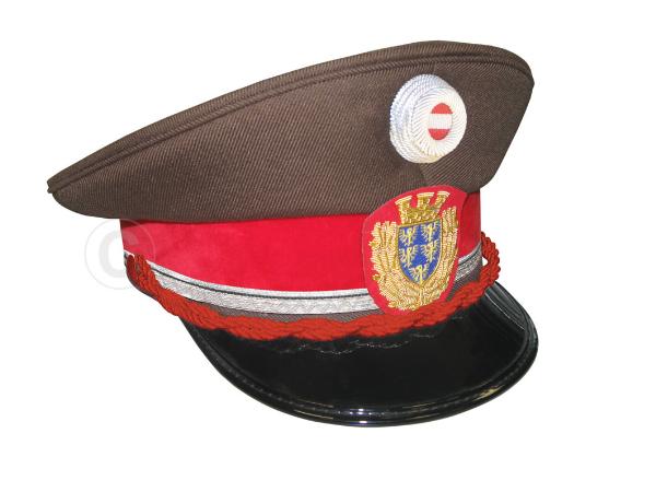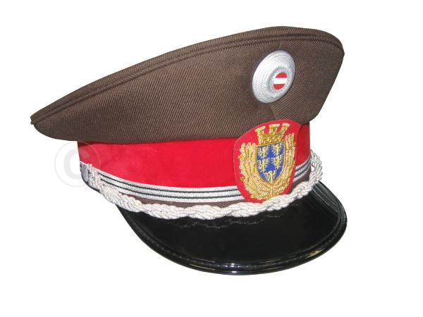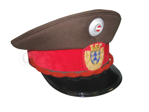 Tellerkappe braun mit Wappen NÖ - BI, OBI, HBI, VW, OVW, HVW, BV, FA, FJ, FK, FTTellerkappe Farbe braun, aus Kammgarn-Serge, gefüttert, mit Schweißleder, mit rotem Samtumlaufstreifen und jeweiligen Dienstgradabzeichen und schwarzem Schirm aus wasserfestem Material, Kappenschnur je nach Dienstgrad , Landeswappen auf Samt gestickt mit Eichenlaub und dazugehöriger Kokarde.Tellerkappe braun mit Wappen NÖ - BI, OBI, HBI, VW, OVW, HVW, BV, FA, FJ, FK, FT |