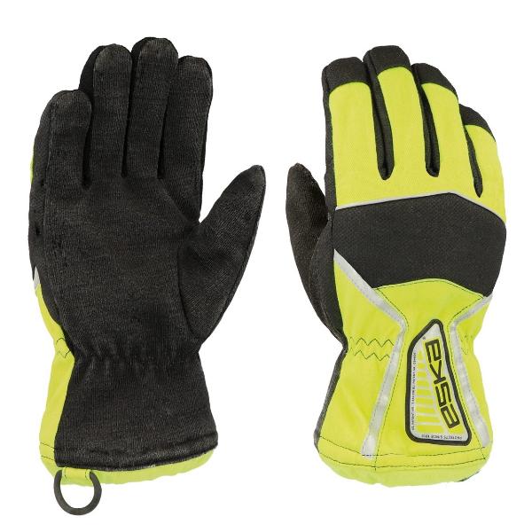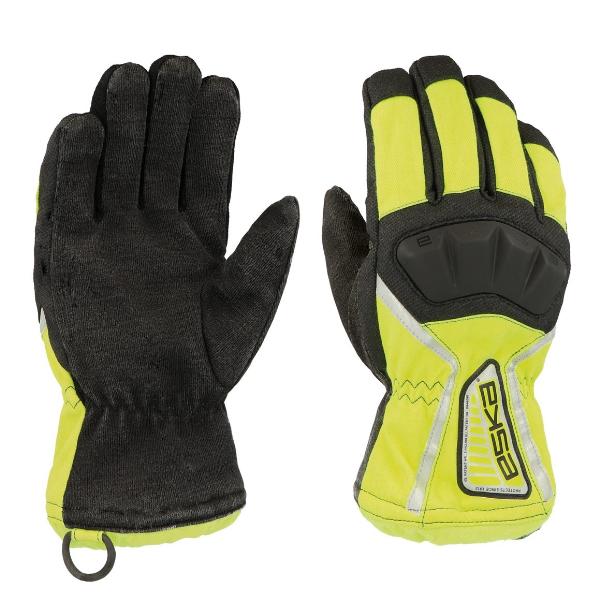 Der wasserdichte FLASH PRO GTX ABVK. gelb wurde speziell für die technische Hilfeleistung entwickelt. Er bietet die besten Schutzeigenschaften gegen Nässe, Wind und mechanischen Gefährdungen, wie Schnitte, Stich oder Abschürfungen. Wenn es um Arbeiten bei verunfallten Fahrzeugen, die Rettung eingeklemmter Personen oder um das Sichern, Heben und Bewegen von Lasten geht, sind die Hände des Trägers dabei maximal geschützt. Das antistatische Obermaterial ist flammhemmend und schützt vor kurzfristiger Flammeinwirkung (Brennverhalten Leistungsstufe 4 zertifiziert nach EN 407), Funkenflug sowie kleinen Spritzern geschmolzenen Metalls (Leistungsstufe 2 zertifiziert nach EN 407). Der resistente Knöchelprotektor (nach ISO 13594:2002 zertifiziert) bietet absoluten Schlag- und Stoßschutz und schützt den Handrücken zusätzlich vor Verletzungen. Das von ESKA entwickelte RescutTM Fire Material in der Innenhand bietet höchsten Schnitt- und Abriebschutz gegen spitze Gegenstände, scharfe Kanten und Splitter. Es bietet eine hervorragende Griffsicherheit und sorgt zudem für die Langlebigkeit des FLASH PRO GTX ABVK. gelb. Zusätzlich ist der Handschuh nach EN 407 Kontakthitze (Leistungsstufe 1) zertifiziert. Durch das eingearbeitete GORE-TEX Insert ist der Handschuh dauerhaft wind- und wasserdicht, bei gleichzeitig höchster Atmungsaktivität. Die Einarbeitung des Innenfutters, die Fixierung des Inserts und die Verbindung mit der Außenhülle erfolgen nach dem bewährten, von ESKA patentierten Verfahren, um ein unerwünschtes Herausziehen des Futters zu verhindern. Die anatomische Schnittform des Handschuhs ist der natürlichen Haltung der Hand angepasst, um eine optimale Passform zu gewährleisten. Die silber reflektierende Paspelierung sowie das Reflexlogo sorgen für eine bessere Sichtbarkeit. Die Gummibandraffung am Handgelenk dient zum Schutz gegen Eindringen von Glassplittern und Schmutz ins Innere des Handschuhes. Die seitlichen Ösen und der mitgelieferte Karabiner dienen zur Befestigung der TH Handschuhe an der Einsatzjacke.