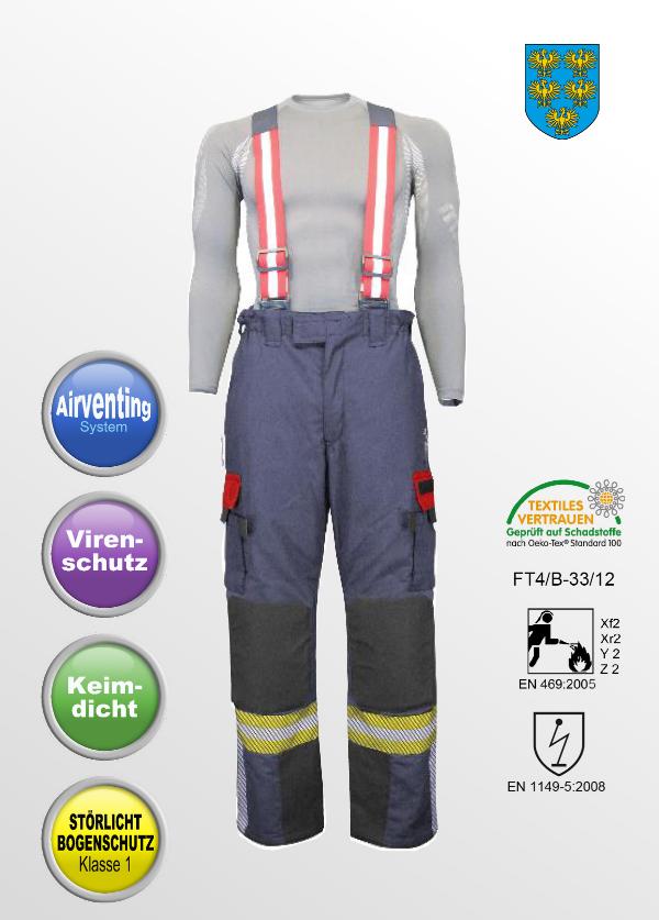 Die Schutzhose X2 ADAS® für BRANDBEKÄMPFUNG mit VIRENSCHUTZ, Schutz gegen elektrischen LICHTBOGEN, ELEKTROSTATISCH, technische RETTUNG.Zertifiziert nach:
