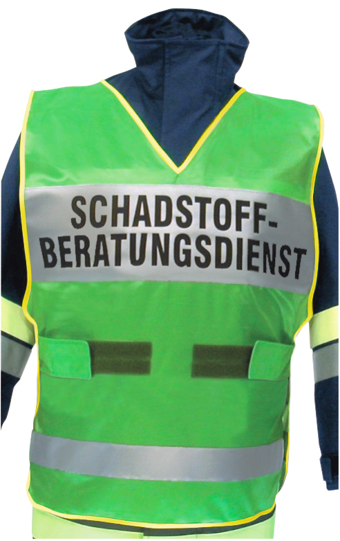 lAusführung: Rundhals, 3M Reflexstreifen am Vorderteil und am Rückenteil, senkrecht und waagrecht. Weiters befindet sich auch auf beiden Seiten eine Beschriftung in schwarz.