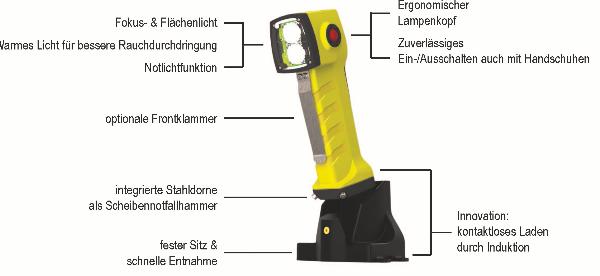 andlampe KSE SUPAHERO-0-SIGHT KS-8001-0S, 400lm, Power-/Fokus-/Flächen-/Blinklicht, 3,5/4,5/10,5/11h Licht, Fokuslicht warm, Flächenlicht kalt, Li-Io Akku, Ex-Schutz: ATEX Zone 0/20/21/22, 1G, 2D, M1, H2, Notfalllicht, Notfallhammer, EN60079-0:2018, EN60079-28, induktives Ladegerät extra bestellen