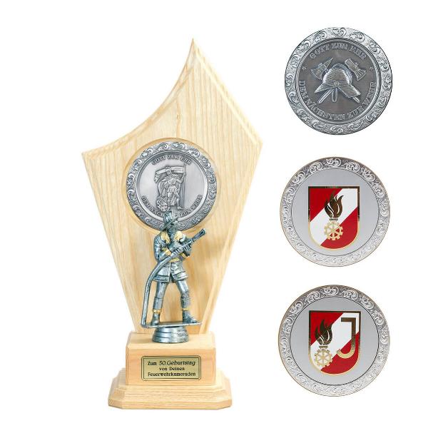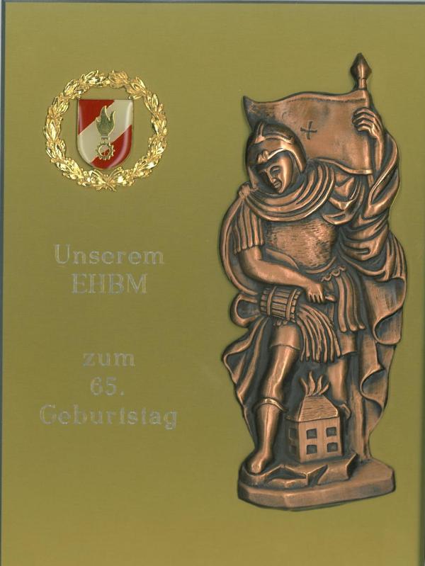 Ehrenplakette mit Korpsabzeichen und Florian mit Etui 25,5 cm