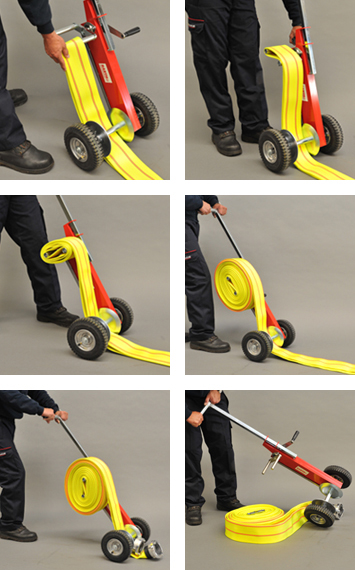 Der Schlauchaufwickler zum manuellen Aufrollen von B-, C- und D-Druckschläuchen bis 30 m Länge, einfach gerollt oder auf halbe Länge gefaltet. Pulverbeschichtete Haspelscheibe, 560 mm Durchmesser, abnehmbare Schlauchführung und Handkurbel, Ablaufbremse zur Vermeidung selbsttätigen Abwickelns der Schlauchrolle. Bodenplatte und Ständer aus Stahl, pulverbeschichtet. Standfestes Gerät, handlich und leicht zerlegbar, Stabiler Standfuß mit Bodenplatte, geschlossene Haspelscheibe, Ablaufbremse und Handkurbel mit integrierter Schlauchführung. Oberflächen lackiert bzw. verzinkt.